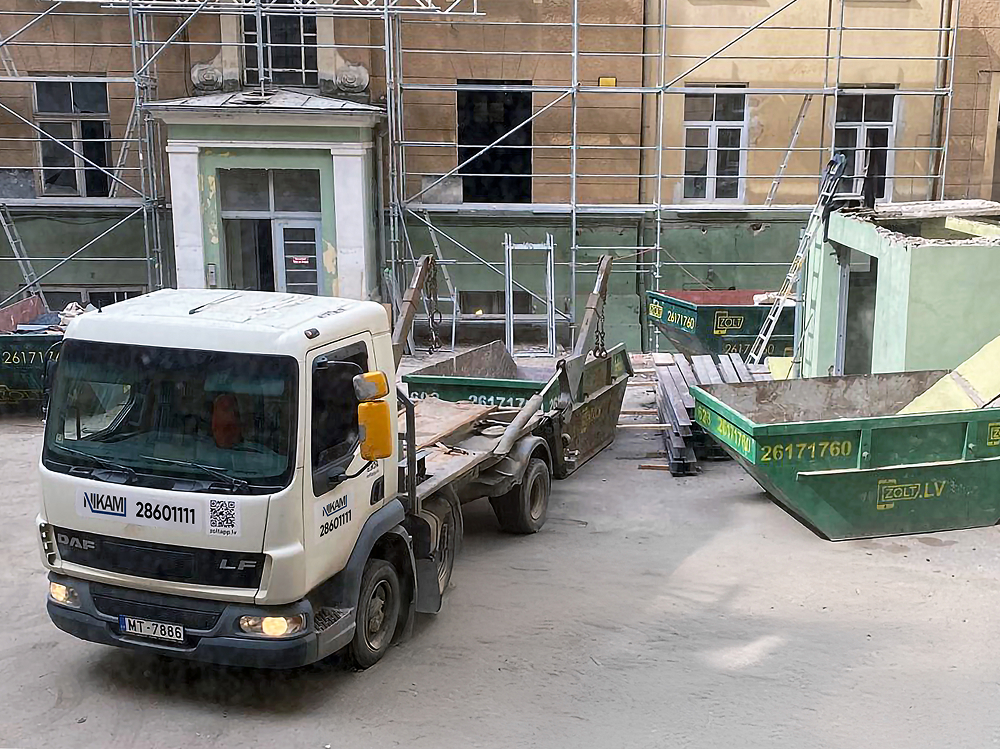 Konteineru iznomāšana un izvešana būvgružiem Rīgā. Konteiners tiek izņemts jebkurā laikā, kad to pieprasa klients.